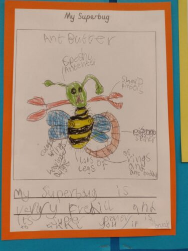 Years 1 and 2 have been doing some amazing work as part of their Minibeasts topic.  They have been looking closely at their resident class caterpillars.  They watched as each caterpillar shed its skin to form a chrysalis. This inspired the children to do some great writing.  They then made dried clay superbugs and painted them in their habitats.