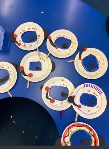 Year 5 and 6 are doing forces and space for their topic. This week some year 5 children spent a session making some great astronaut helmets for a display.