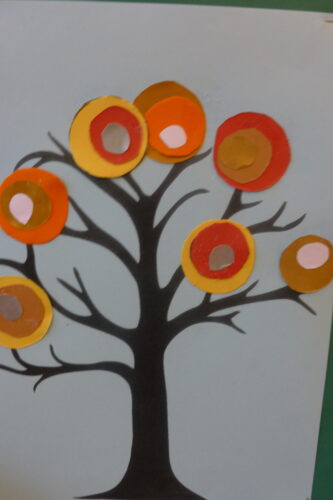The Reception children used his idea of circles to create colourful rings into round leaves. They used paper instead of paint. The result is these beautiful autumnal trees.