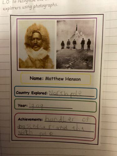 In History, KS1 have been learning about famous explorers. The children created trading cards for Mary Kingsley, Christopher Columbus, Matthew Henson and Dame Ellen MacArthur, showcasing what they learned about each explorer.