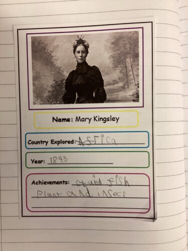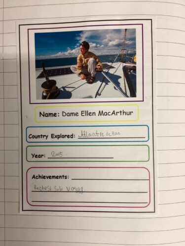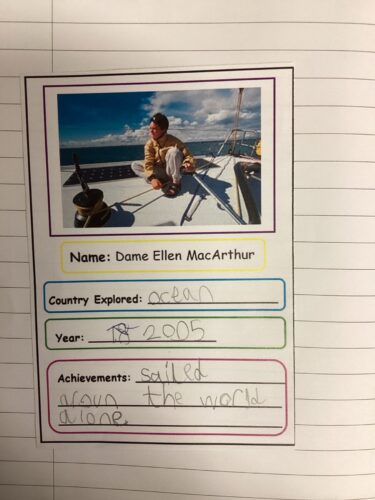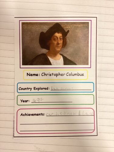 In History, KS1 have been learning about famous explorers. The children created trading cards for Mary Kingsley, Christopher Columbus, Matthew Henson and Dame Ellen MacArthur, showcasing what they learned about each explorer.
